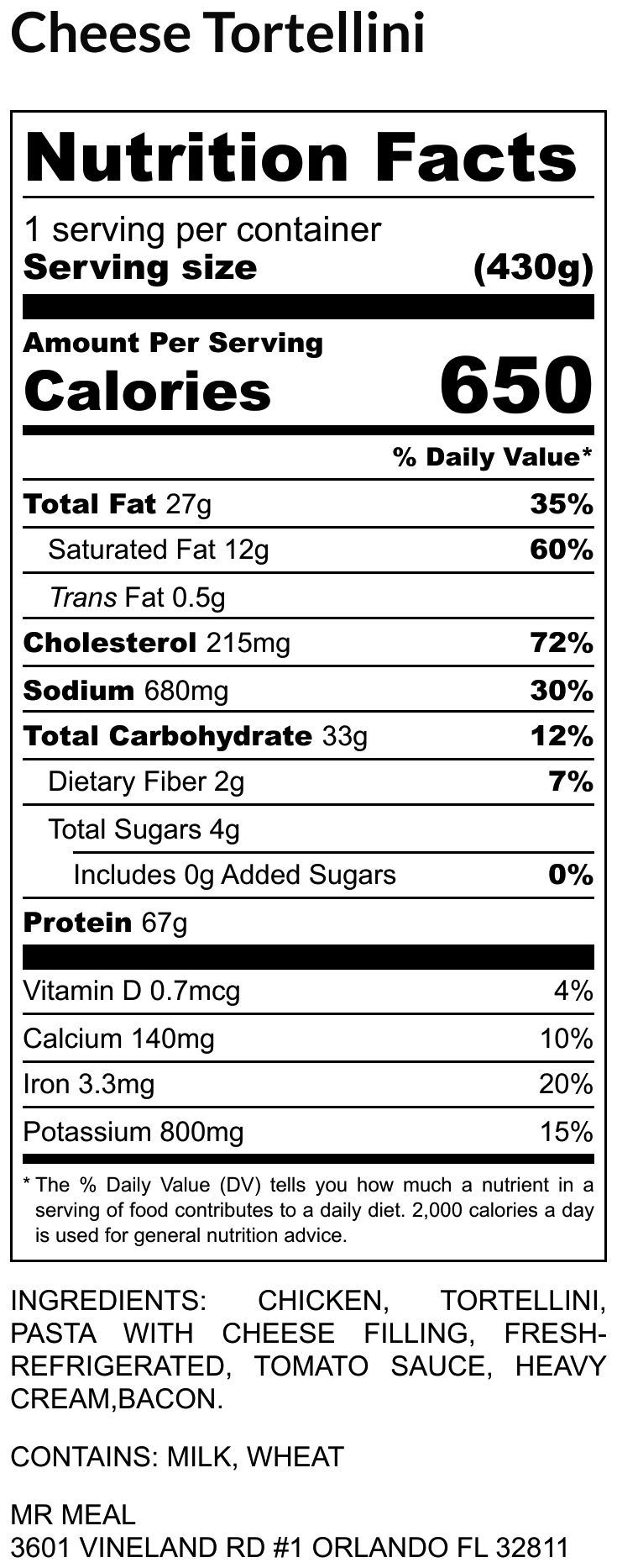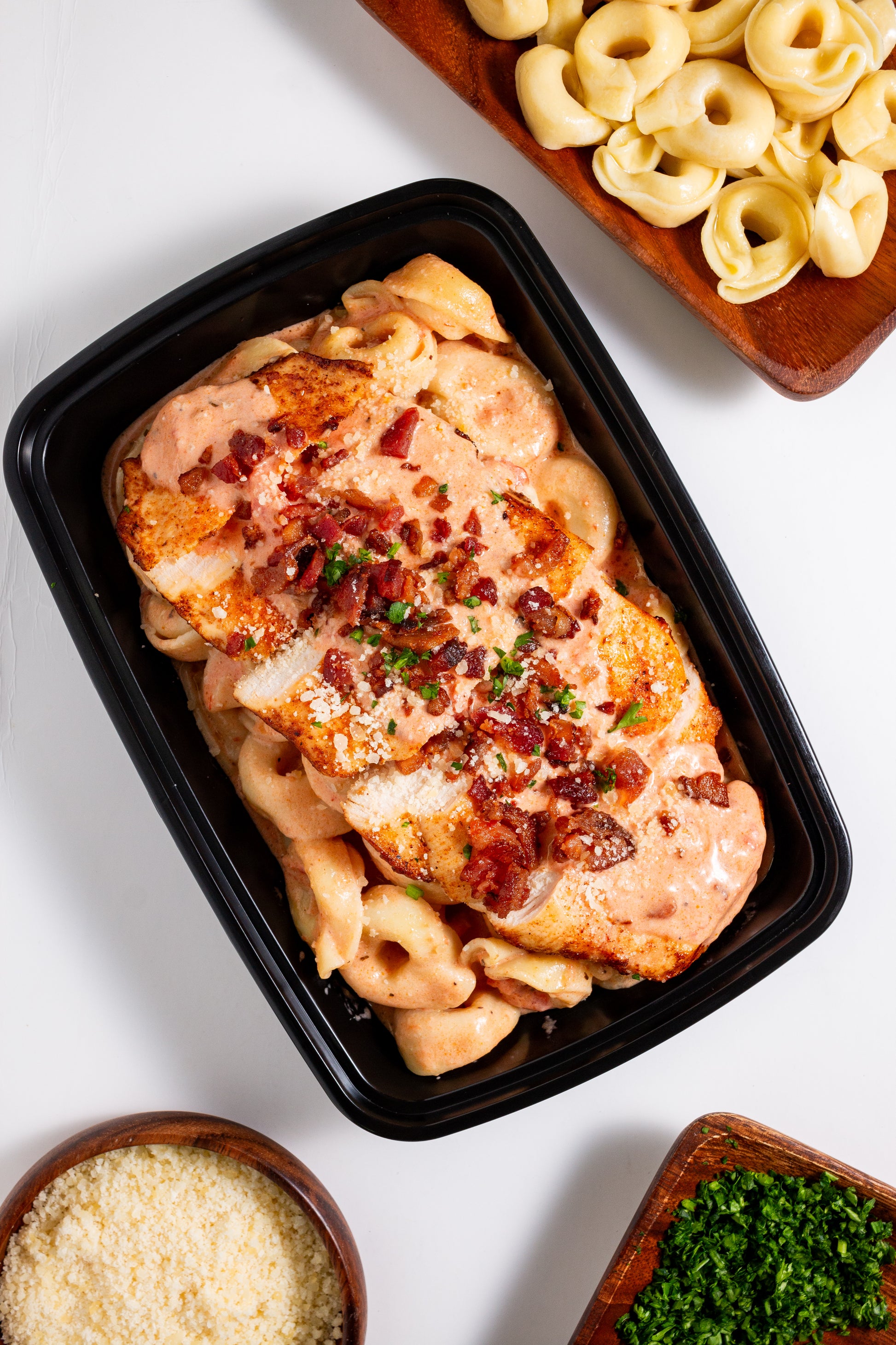 Cheese tortellini pasta topped with 6oz grilled chicken breast, crispy bacon, creamy vodka sauce, and finished with parmesan cheese.