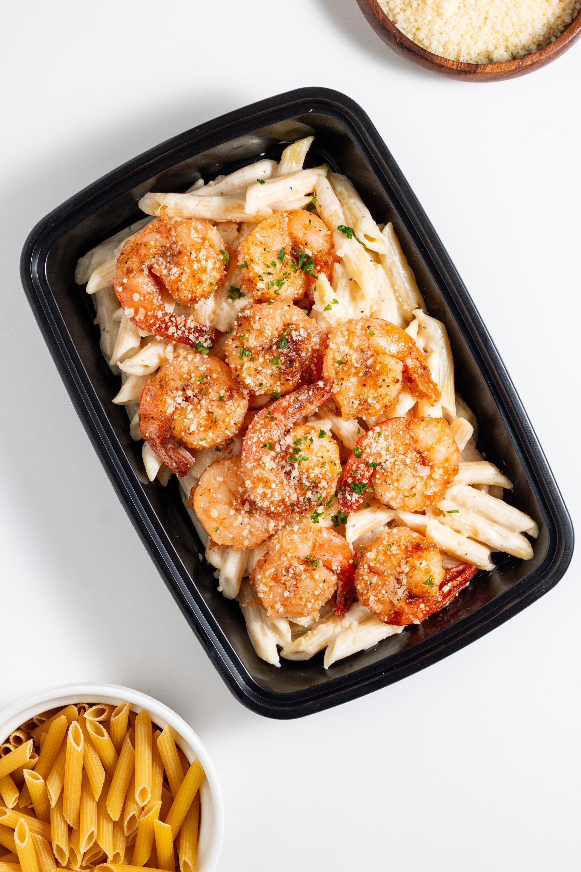 Penne pasta topped with 6oz of succulent shrimp, smothered in a rich, creamy Alfredo sauce, and finished with a sprinkle of parmesan cheese.