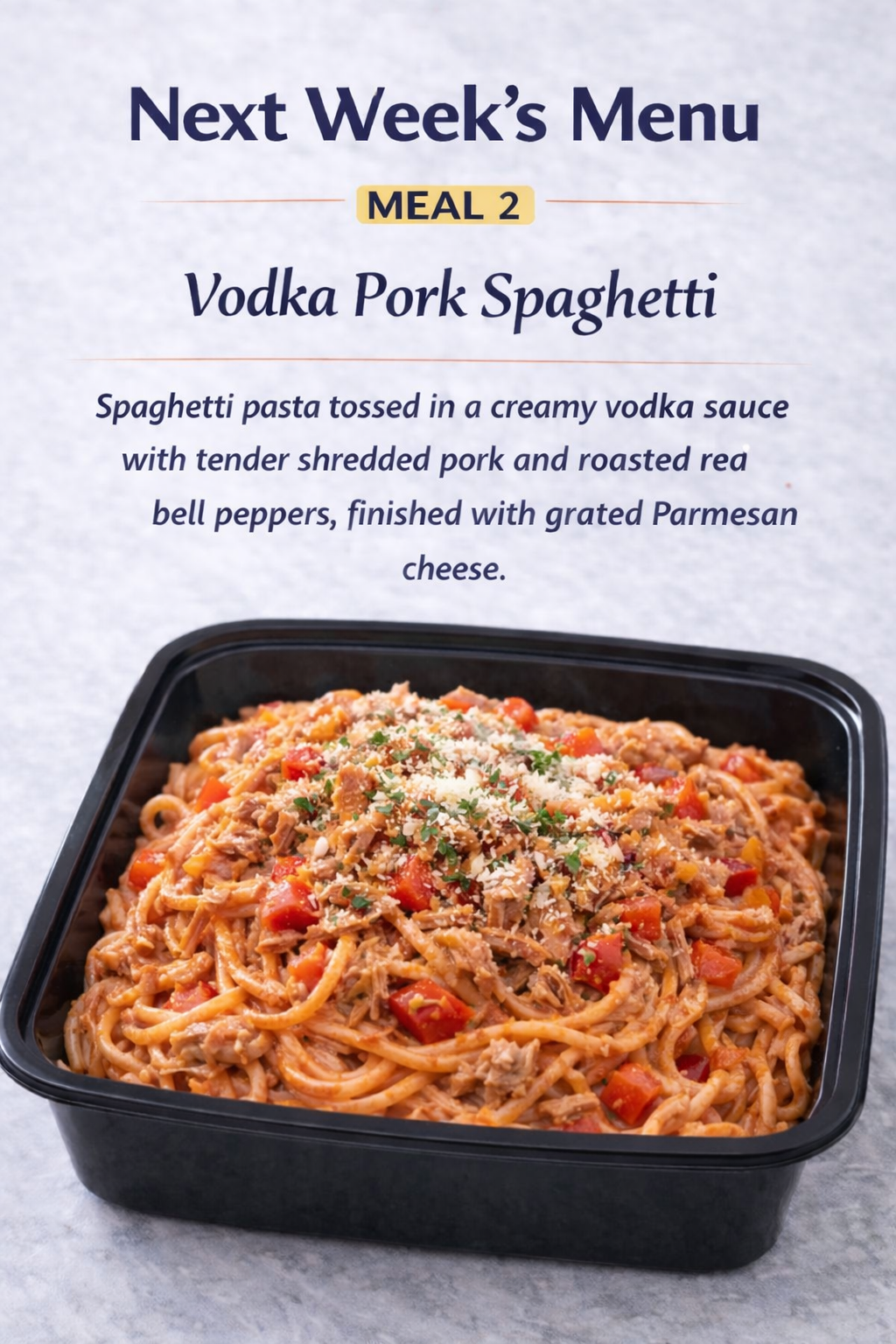 Spaghetti pasta tossed in a creamy vodka sauce with tender shredded pork and roasted bell peppers, finished with grated Parmesan cheese.