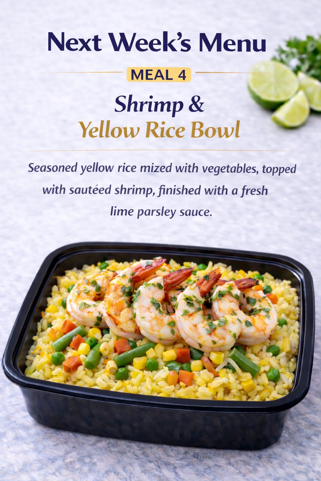 Seasoned yellow rice mixed with vegetables, topped with sautéed shrimp, finished with a fresh lime parsley sauce.